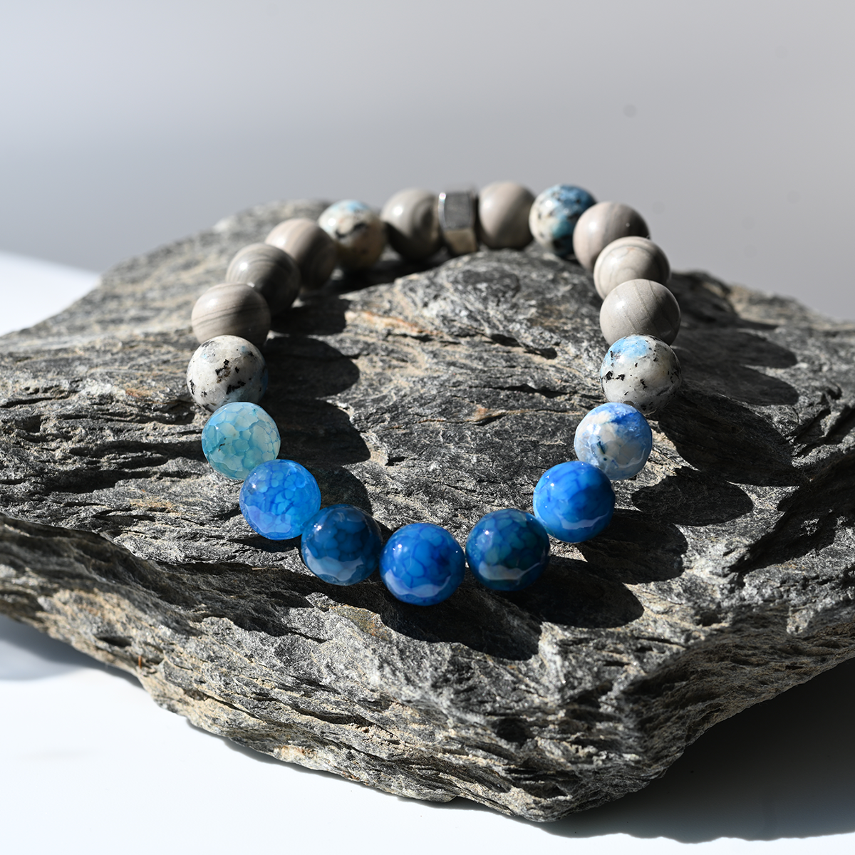 Ordinær pris 449,00 NOKSalg pris 449,00 NOK Ordinær pris 399,00 NOKEnhetspris / perArmbånd med 10 mm naturlige steiner: blågrå jaspis, grå stripete jaspis og blå drage-agat. Den rustfrie stålmutteren tilfører et maskulint og robust uttrykk. Elastisk strikk gjør...