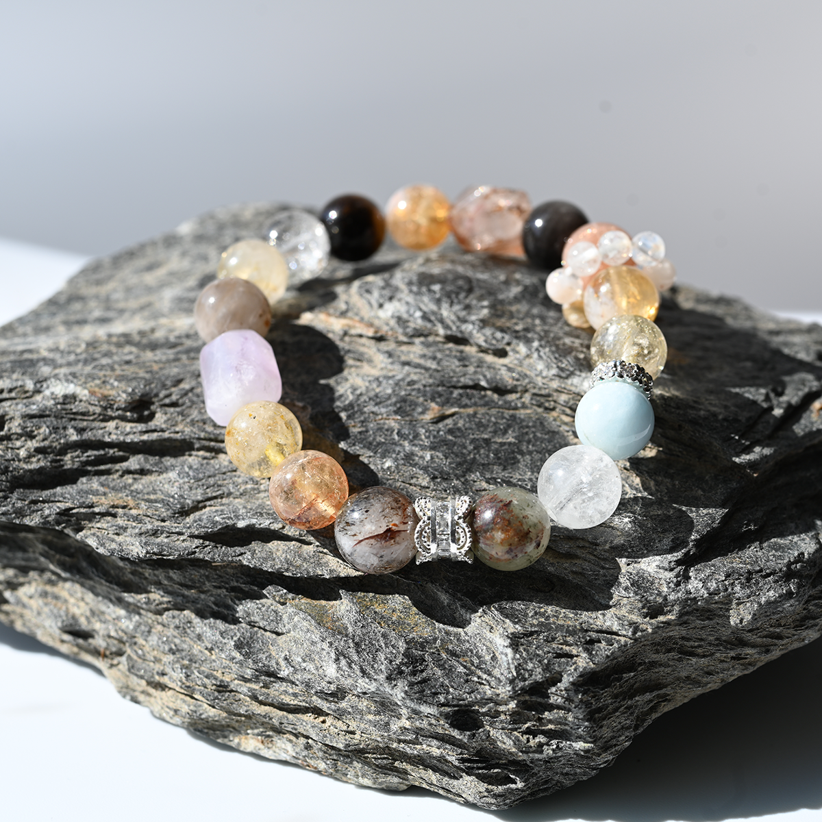 Unikt og søtt armbånd med lyse nyanser av 10 mm mix kvarts. De naturlige variasjonene gir et friskt og personlig uttrykk, mens kobberdetaljer og elastisk strikk sørger for både stil og komfort.