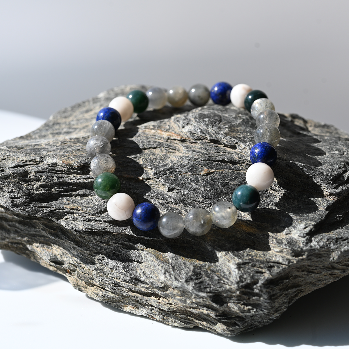 Et armbånd med 8 mm labradoritt, sodalitt, hvit agat og mose-agat. Steinene skaper et naturlig spill av farger og mønstre som minner om en steinete elv – rolig, jordnært og unikt. Montert på elastisk bånd for behagelig passform.