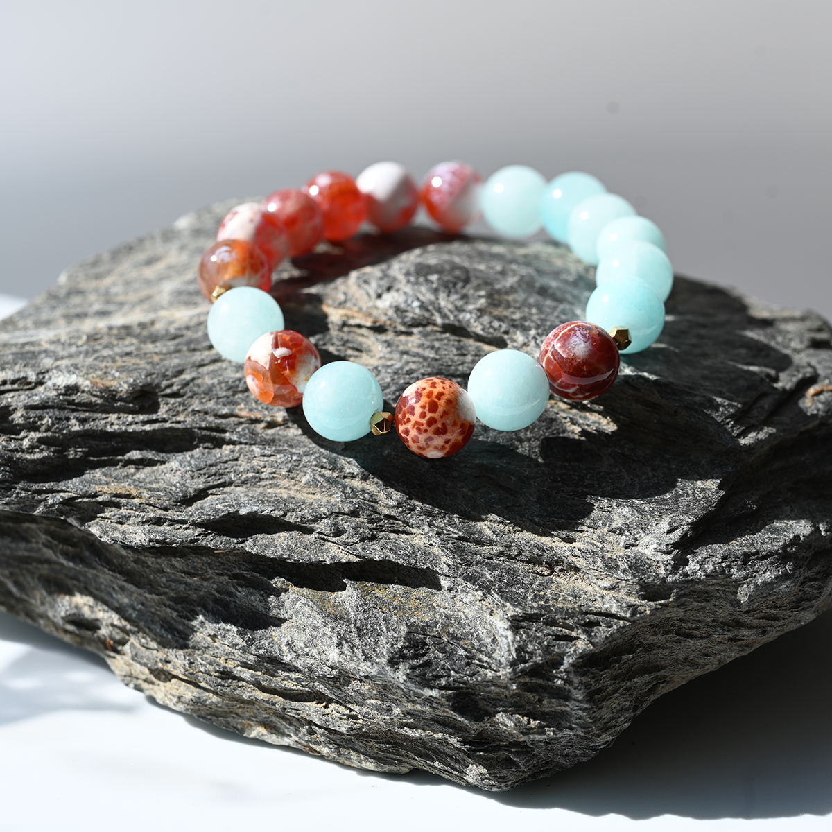 Et armbånd som kombinerer 10 mm lyseblå agat og 10 mm fasettert oransje ildagat. Gullfargede hematitt-detaljer gir en luksuriøs touch, mens elastisk strikk sikrer komfort.